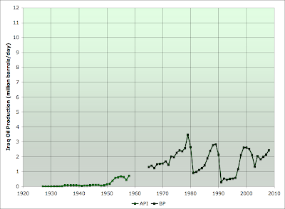 However, Iraqi historical production is very jagged. Shit happens in Iraq. Was it all because of the Baathist regime's behaviour? Or are there deeper currents that pretty much guarantee instability. e.g. It could prove difficult to prevent another strong man from emerging. Even for economic reasons, neighbours might prefer an Arab Chavez ran Iraq (lower and less efficient production) and have the wherewithall to help that scenario and avoid a democratic feeding frenzy.