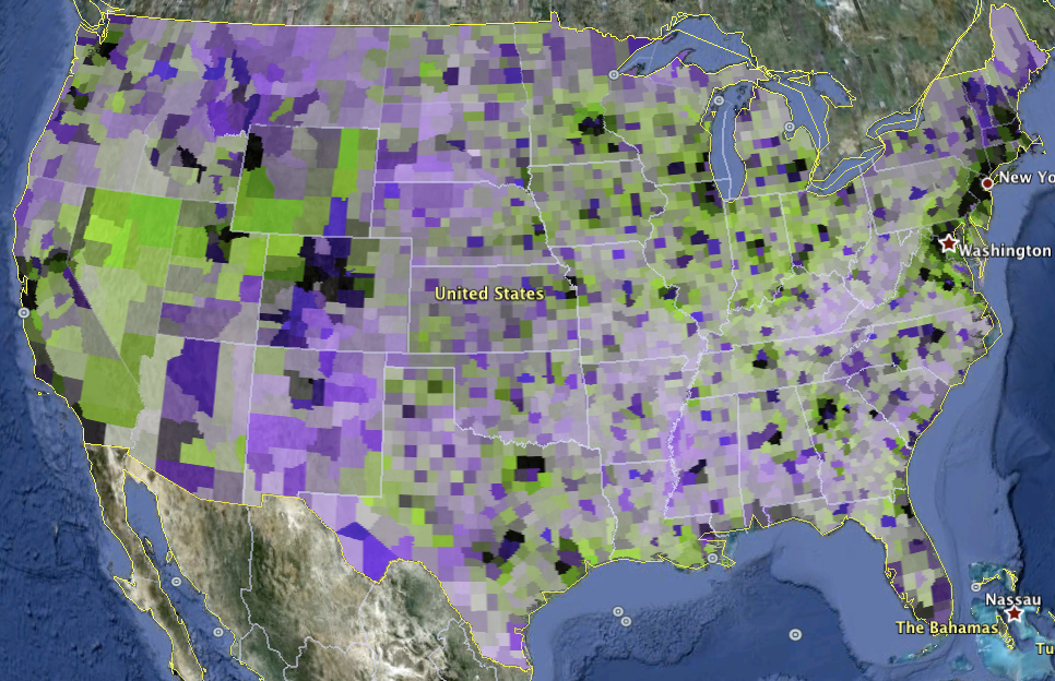 Next is one of those two-factor correlation maps for education and median household income. Dark means both education and income are high (SF Bay area, New York), light means both are low (Appalachia). Purplish means counties have relatively high education for their income, greenish means relatively high income for their education.