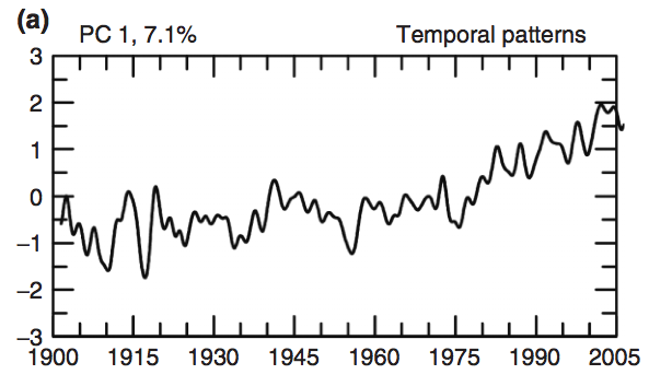 Looking at the first principle component, you see some noisy oscillations until 1960 or so. What happens if you only look at data before that time? Which component is most important on the truncated data set? How about just in data since that time? I guess what I'm asking is how does the magnitude of the principle component change for various long term averages? Clearly, if the trends are largely oscillatory changes like ENSO, the magnitude of the principle component representing that behavior should be roughly the same magnitude as long as you average over several periods. However, with the onset of a unidirectional trend you might expect to see the principle component representing this slowly rise out of the mud. Rather than being just 7% of the signal since 1900, it might represent 20% of the variations today.