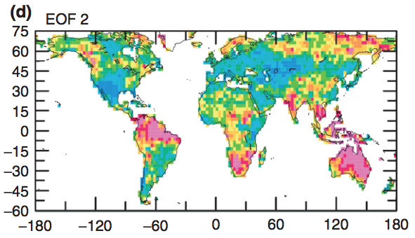As a scientist, I find this amazing. You stick in this PDSI data to a completely physics-agnostic statistical algorithm, and it comes out with "The most important thing going on here is an overall trend to drying in certain places" that roughly matches what climate models say global warming will do, and then it adds "And the second most important thing going on is this oscillation back and forth between drought in some other places" which very closely match the well known El-Nino phenomenon.