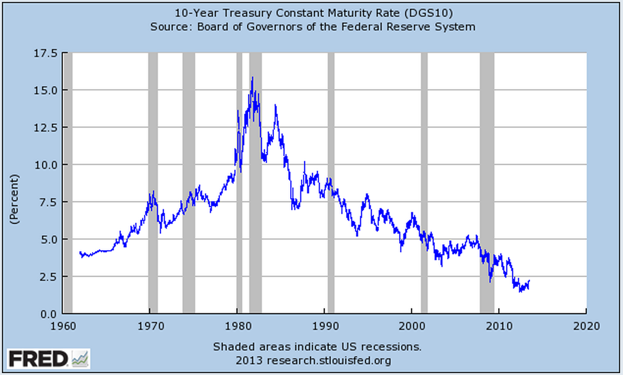 Interest rates have jogged up in recent months and some people are getting apocalyptic about it. The above chart shows thirty year mortgage rates - the little jag up at the very end is the feature of interest. Below is 10 year US government debt.